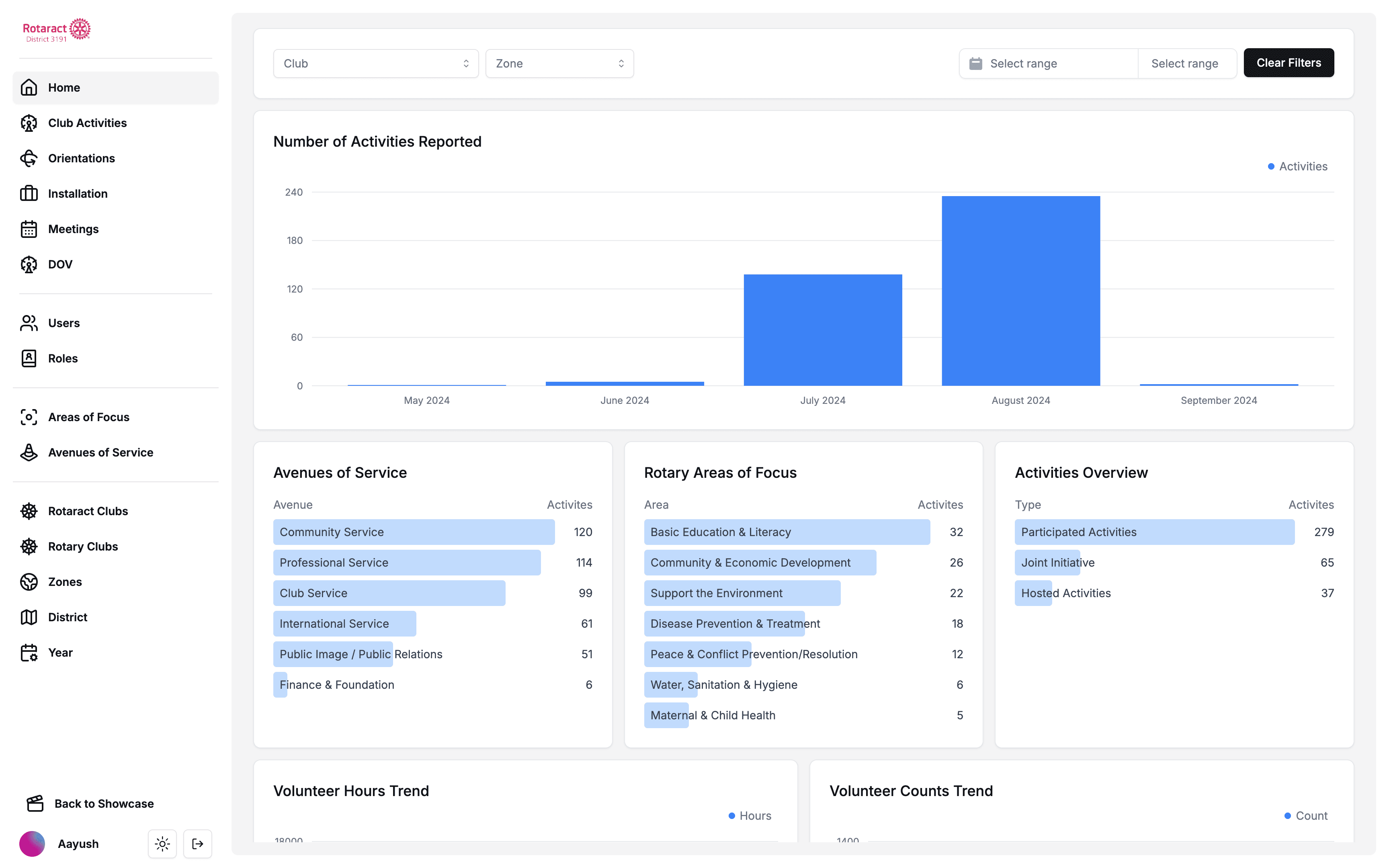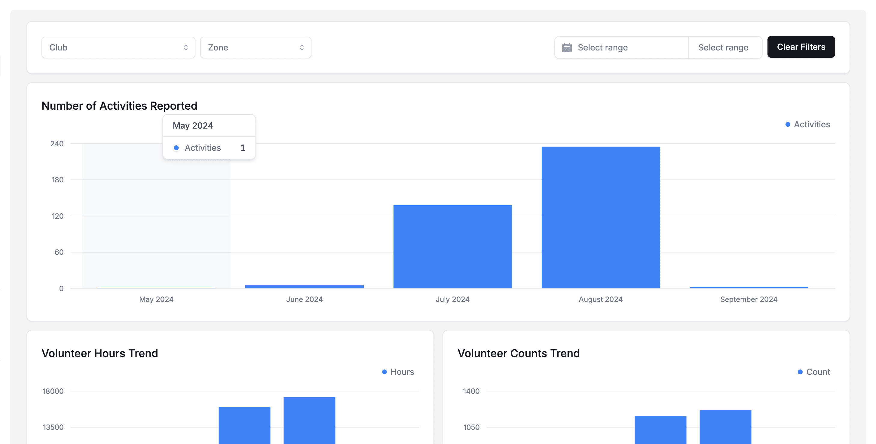Monitor club participation, volunteer hours, and impact metrics across your district.